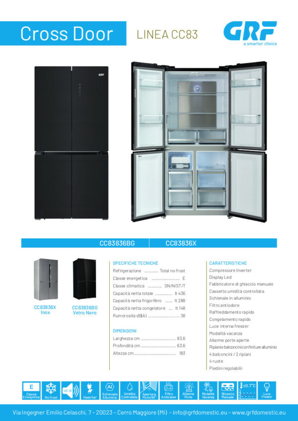 Un prodotto capiente, con un cassetto per conservare frutta e verdura dotato di un sistema di controllo dell’umidità che contribuisce a preservare la qualità e la freschezza più a lungo. I balconcini ampi, con profili in alluminio e trama sul fondo, rendono il frigorifero sofisticato ed elegante.