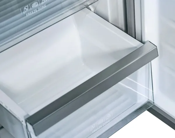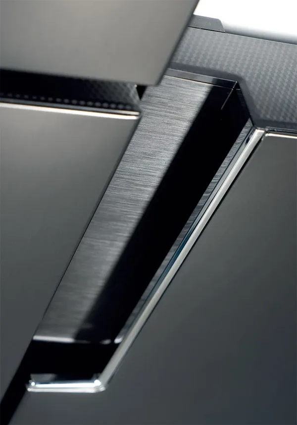 La luce blu che riflette sullo schienale in alluminio, unita all’illuminazione a LED, fa sì che ad ogni apertura della porta il prodotto mostri tutta la sua luminosità, capienza ed eleganza. Ogni dettaglio delle maniglie e del display è impreziosito dalle cromature e da una leggera trama che crea una texture unica. I cassetti sono completamente estraibili.