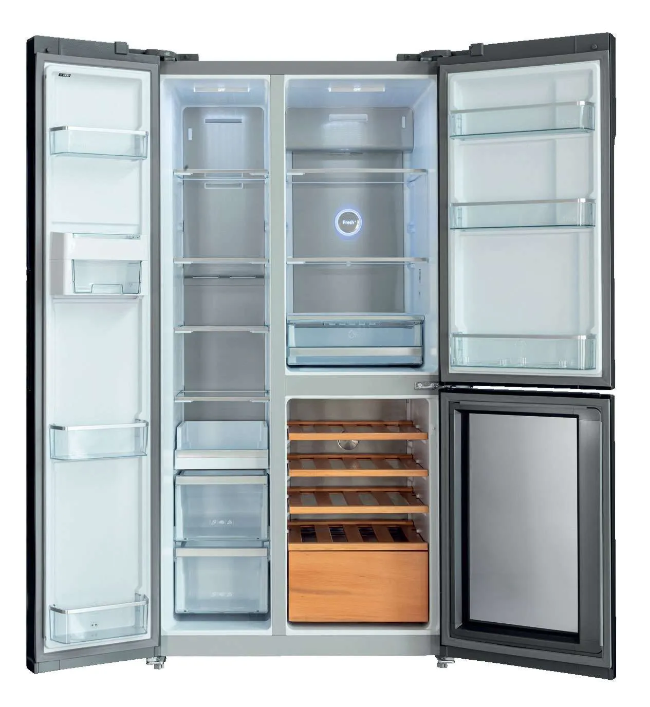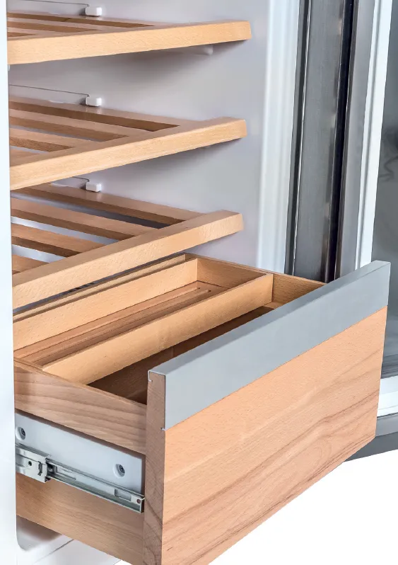 Un frigorifero esclusivo, la scelta intelligente per conservare in uno spazio unico sia il cibo che le bevande. La combinazione dei materiali e delle finiture, il legno di faggio dei ripiani e del cassetto e il vetro esterno, lo rendono davvero elegante e sofisticato. I ripiani possono conservare alla temperatura ideale, tra +5 e +16 gradi, fino a 25 bottiglie. In più c’è un comodo cassetto per altre bevande.