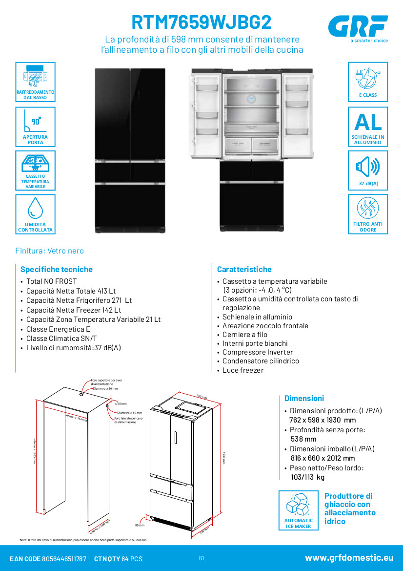 • Capacità Netta Totale 413 Lt